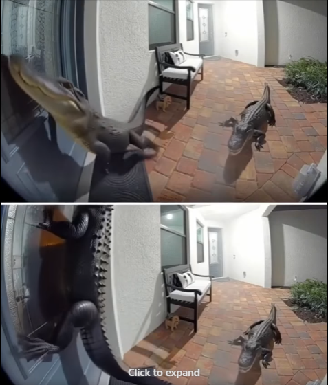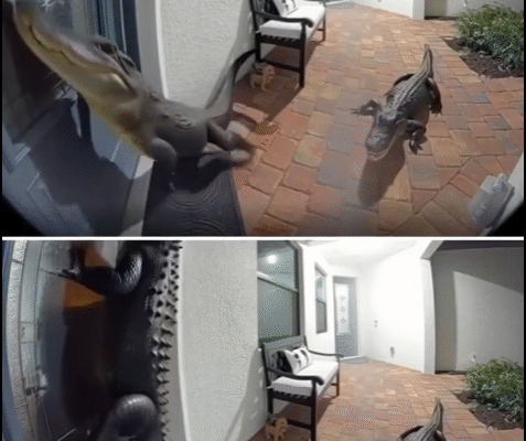 When the homeowners opened the door, they were greeted not by a neighbor, but by two full-grown alligators lounging on the porch. In a moment caught on a Ring doorbell camera, one of the reptiles pushed up onto its hind legs, pressing its snout against the door as though requesting entry, while the second circled and observed with deliberate patience.